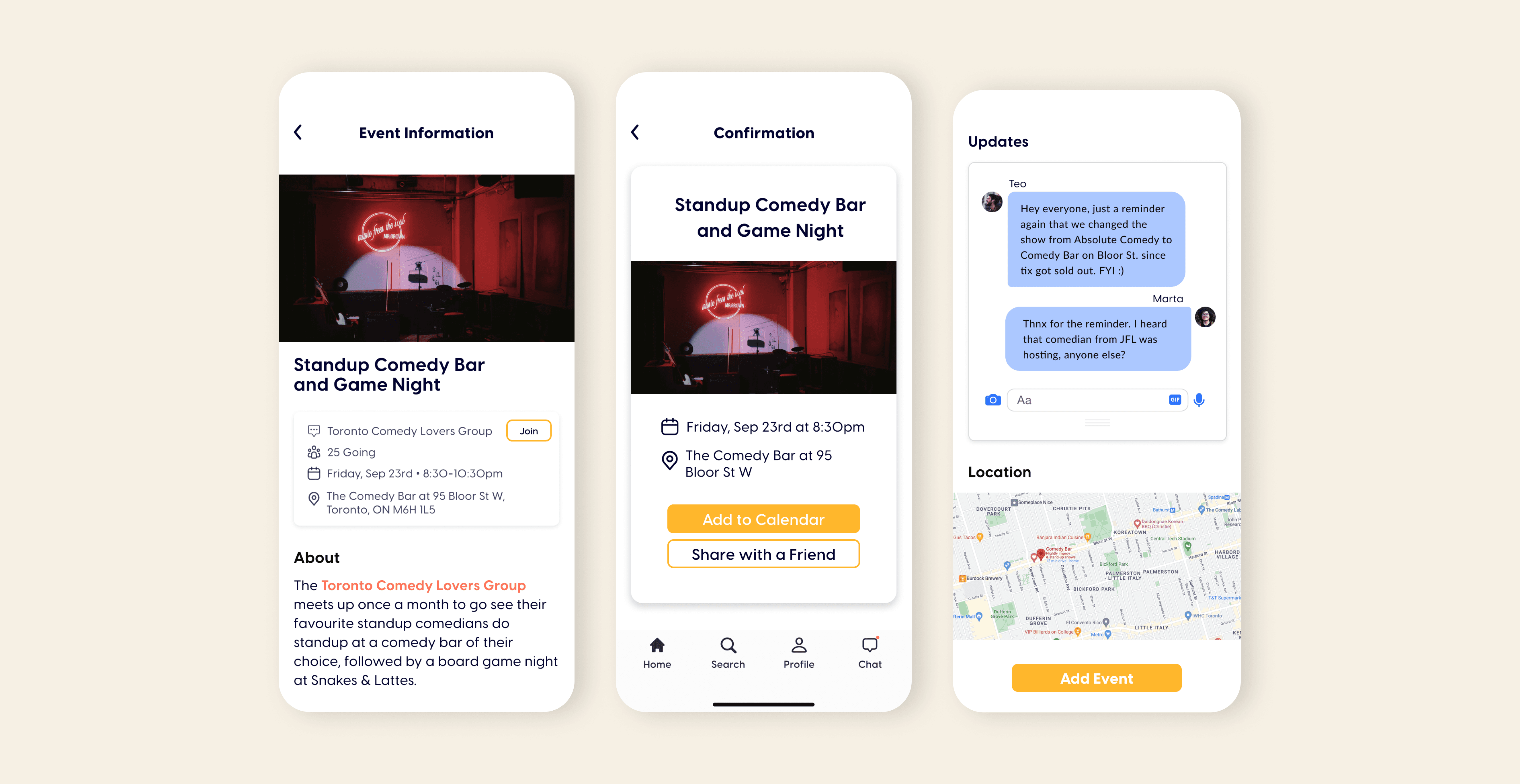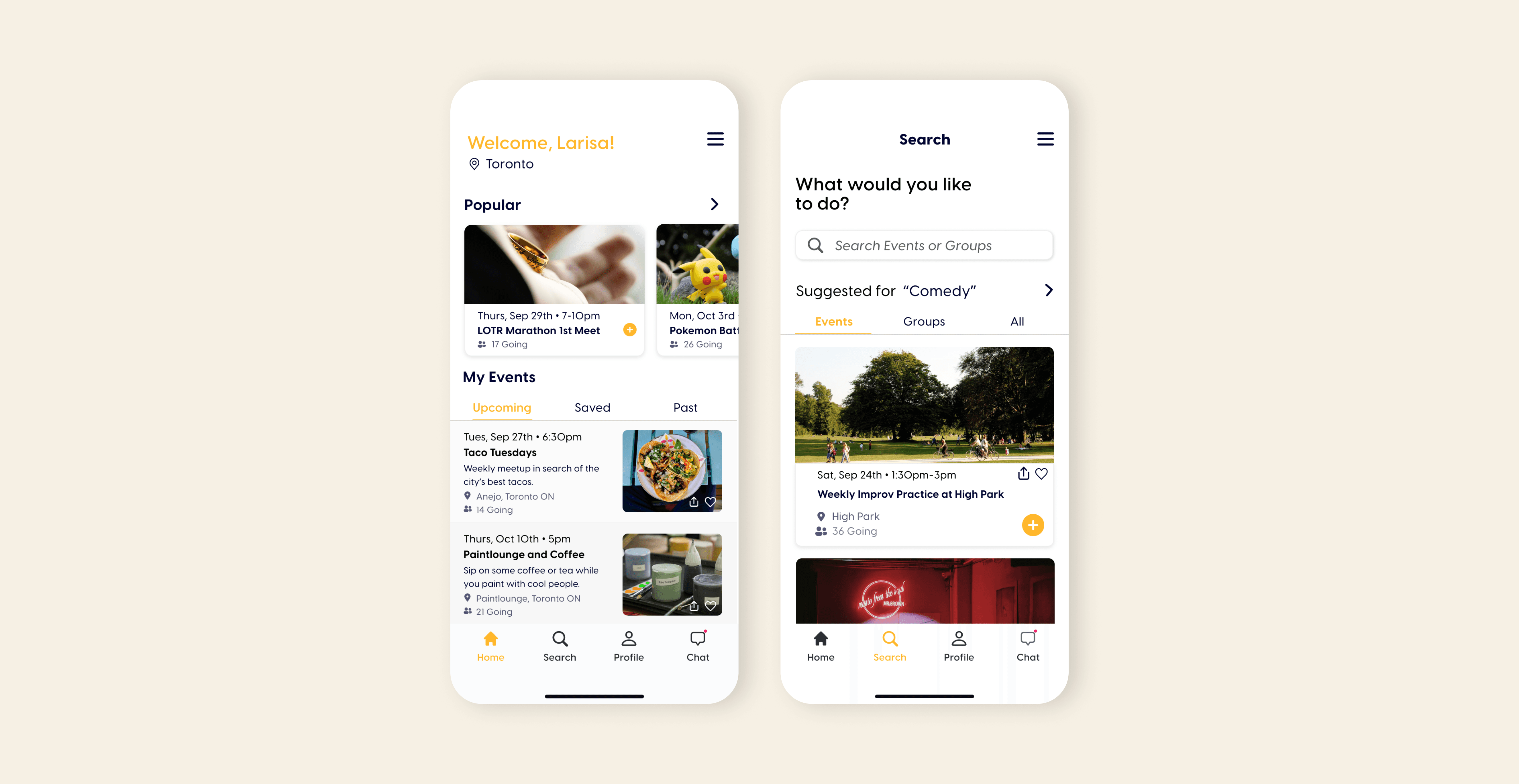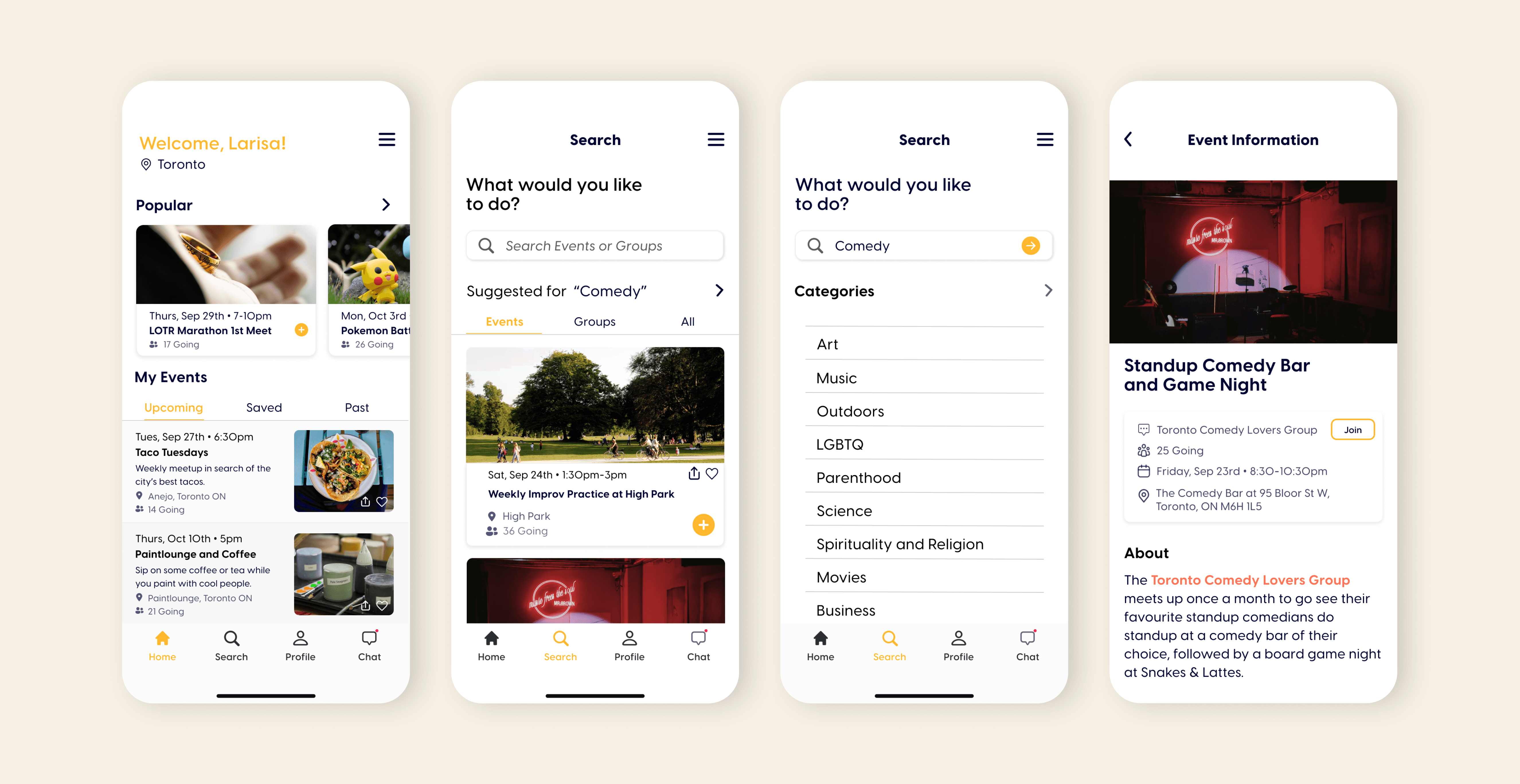 As young adults increasingly face the serious effects of loneliness in North America (see this study…and this one), they need a social platform that helps foster genuine connections effectively. Unlike other social media platforms that encourage increased app screen time, this platform aims to help increase in-person interactions, enabling users to meet locals with similar interests. The obstacle for this case study was to develop a mobile application that is user-friendly and intuitive, and caters to diverse individual's needs while ensuring a seamless user experience. To begin, we needed to ask the following question; what makes young adults feel more connected?