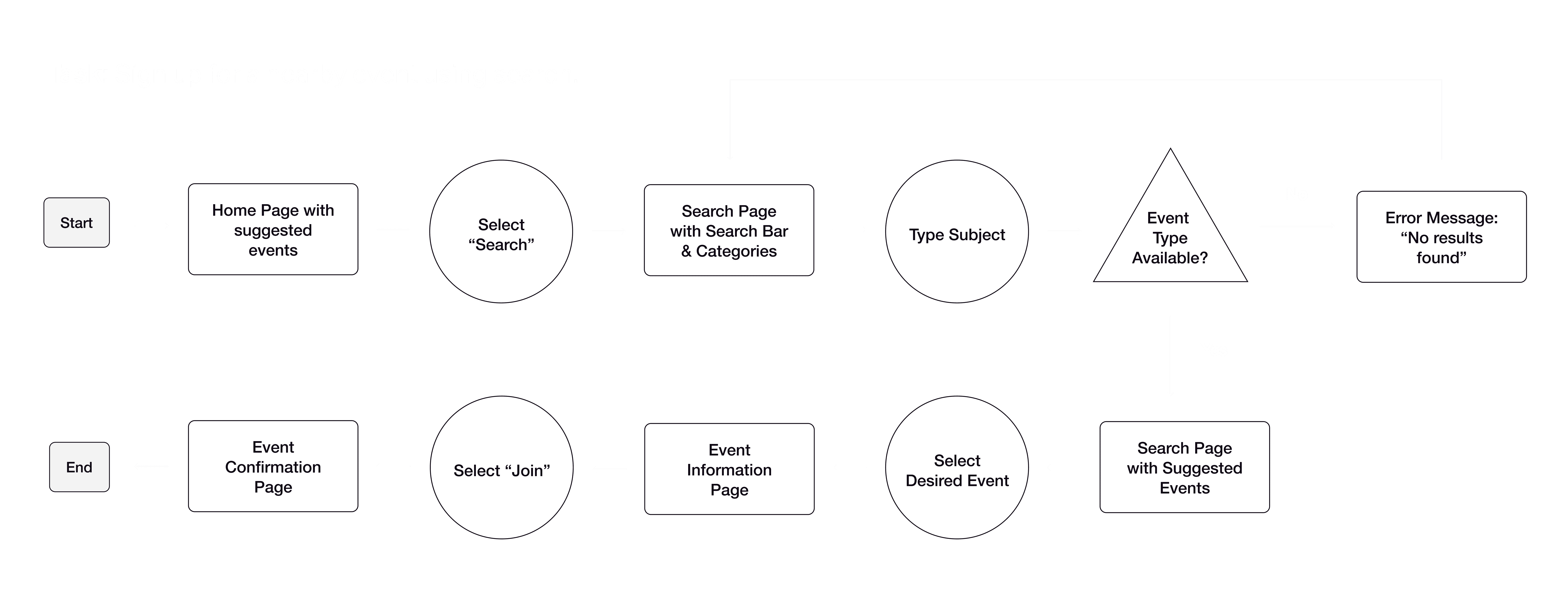 Ideation: I sketched various solutions for each screen based on the task flow above (view all sketches here). Deciding on my final sketches, I created mid-fidelity wireframes and prototypes. From start to finish, a user should be able to sign up for a nearby event based on their interest.