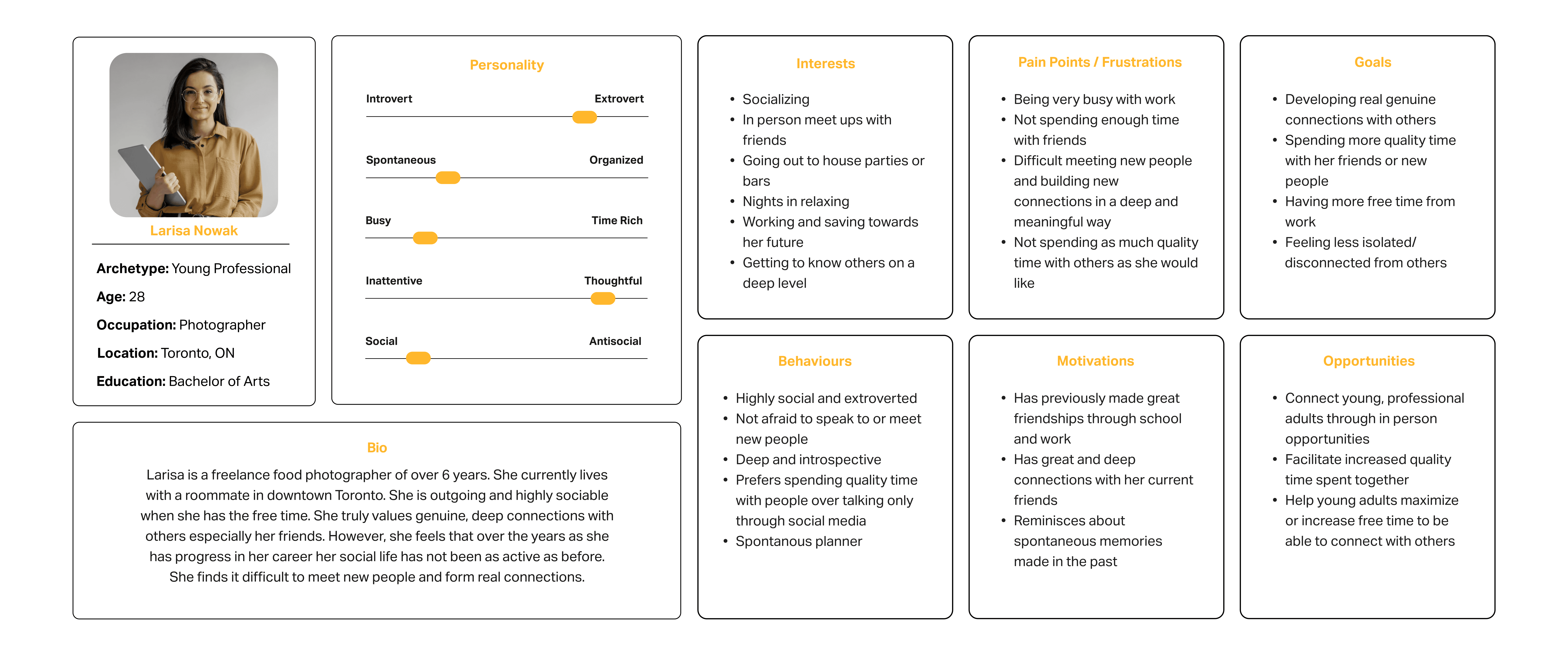 Persona + Task Flow: To help me visualize the experience in the social platform from the perspective of the user, I created the following persona based on the survey data. Larisa is a busy working professional in her 20's living in Toronto, who craves more genuine social connections.