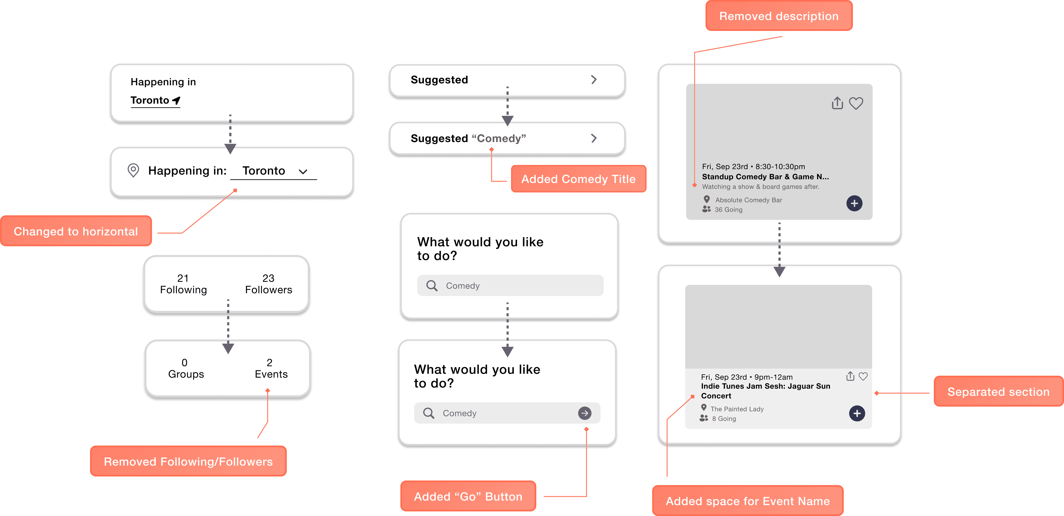 Despite challenges in the initial wireframe and prototype where users were stuck after trying to search for an event, design changes based on extensive user feedback provided the necessary insight as to what needed to be improved. By implementing the high yielding changes, task completion rose from 60% to 100%. It is clear that feedback and testing is crucial to developing a working digital product that delights users.