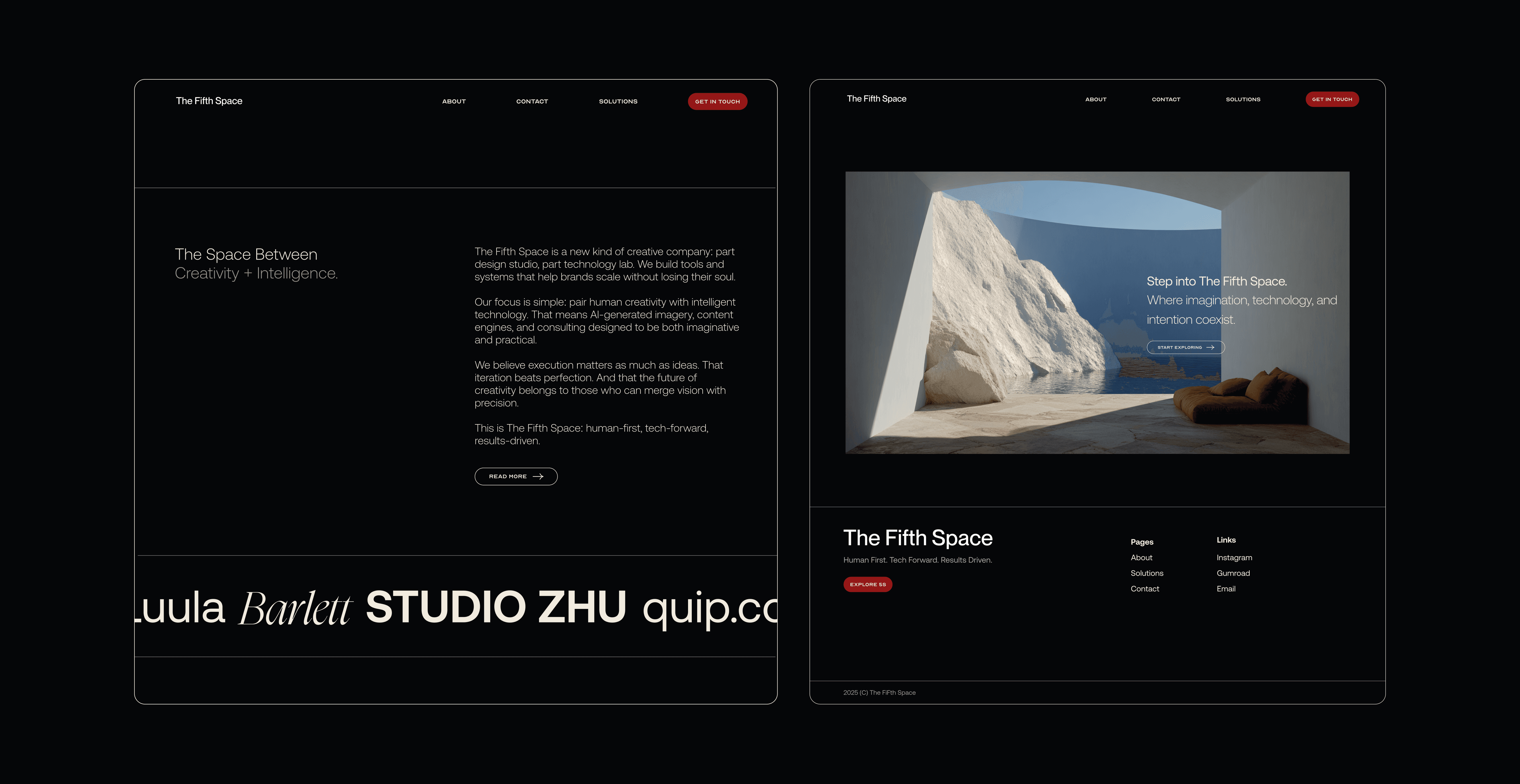 A brand and website exploration for The Fifth Space, a creative technology studio operating at the intersection of human creativity and AI-powered systems. The project focused on defining a distinct visual language, designing a scalable digital presence, and translating an abstract brand philosophy into a clear, compelling web experience. Work included concept development, art direction, and high-fidelity web design explorations.